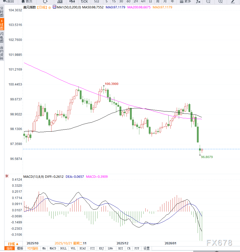 从关键价位观察,97.00整数关口 已成为当前重要的心理支撑位。若该位置失守,指数下行空间或进一步打开,下方关注 96.50 以及 96.00区域。这些位置一旦被测试,市场对美元的悲观情绪可能进一步放大。