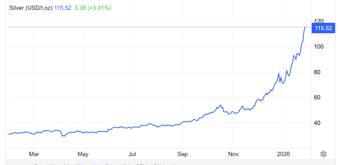 周一的狂热涌入之际,iShares Silver Trust ETF价值上涨近6%,推动其2026年迄今涨幅超过55%,并延续了去年近145%的惊人涨势。上周五晚些时候,白银价格有史以来首次突破每盎司100美元大关。
