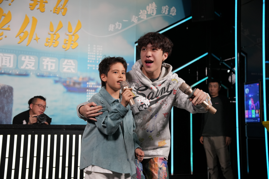 两位小演员朱佳煜(右)、黄韵洲共同演唱歌曲,带热发布会敌对