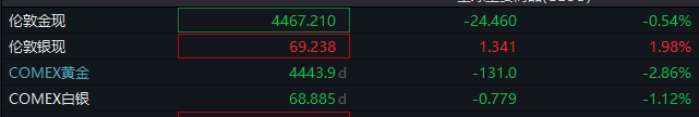 巨额商品方面,黄金期现跌幅均收窄,白银现货转涨。