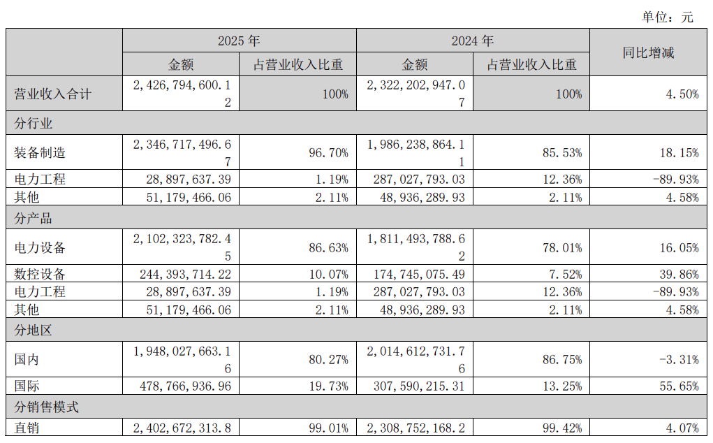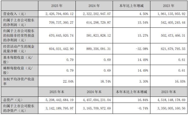 财务数据暴露,2025年,华明装备完了买卖收入24.27亿元,同比增长4.5%;归母净利润7.10亿元,同比增长15.54%;扣非后净利润为6.71亿元,同比增长15.27%。