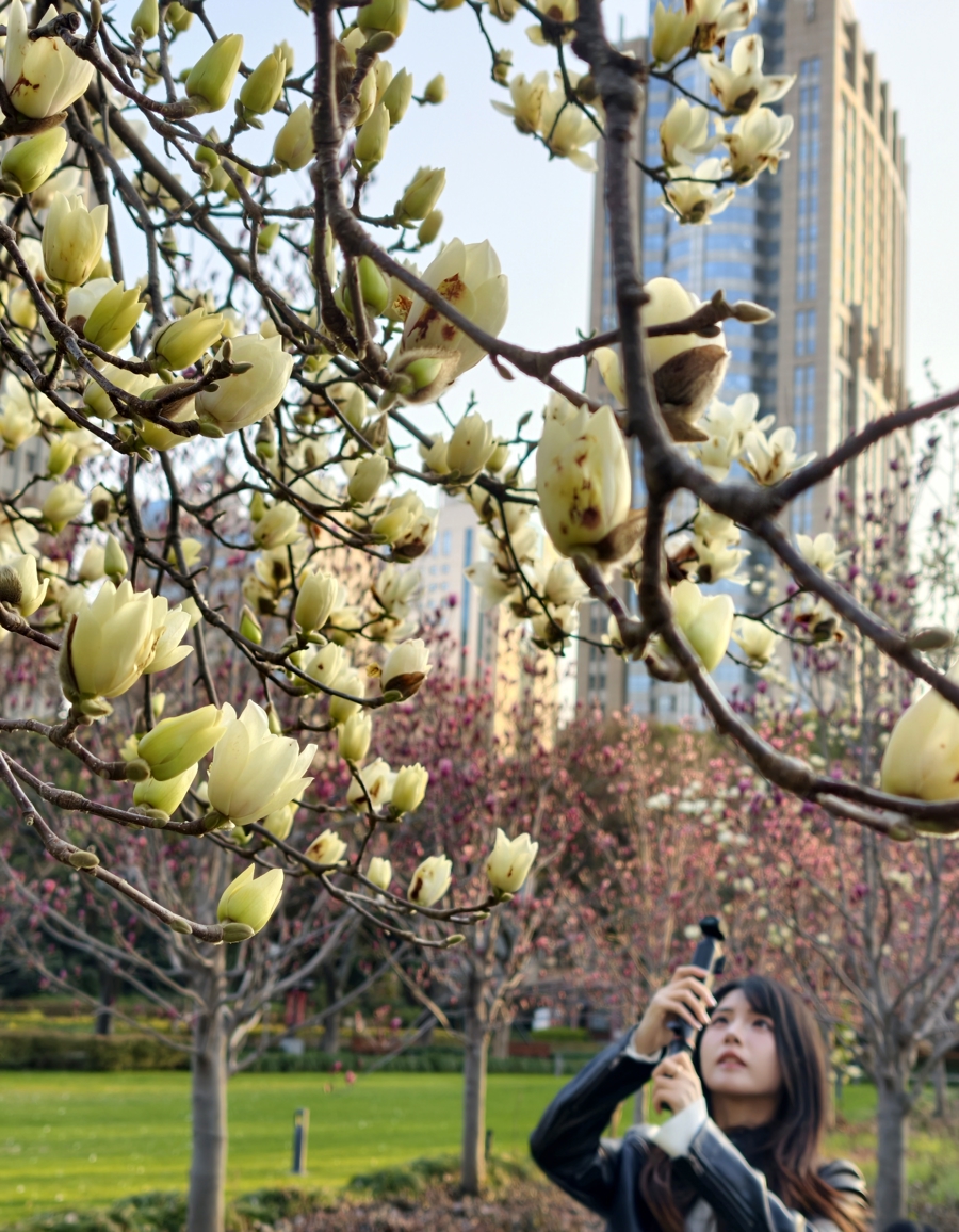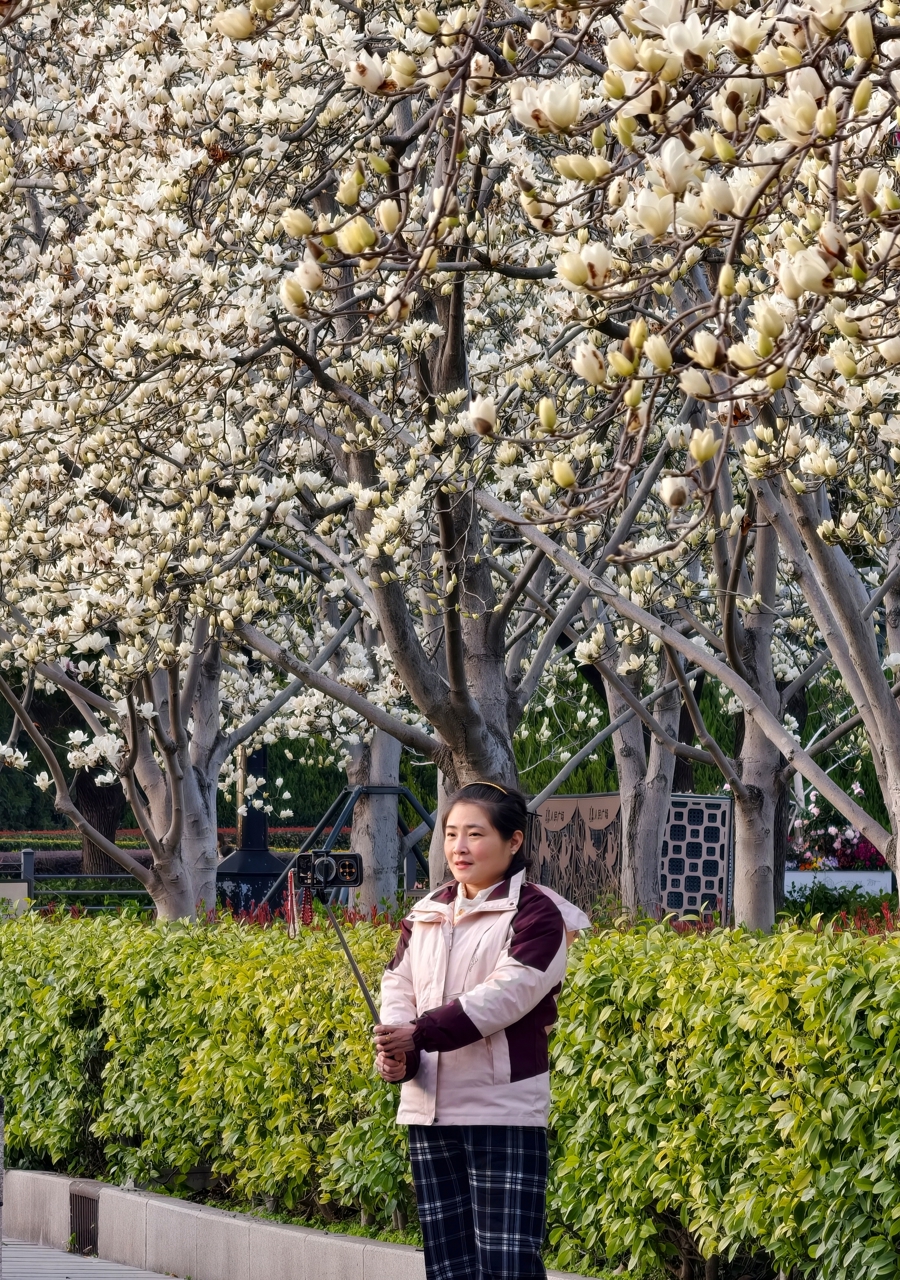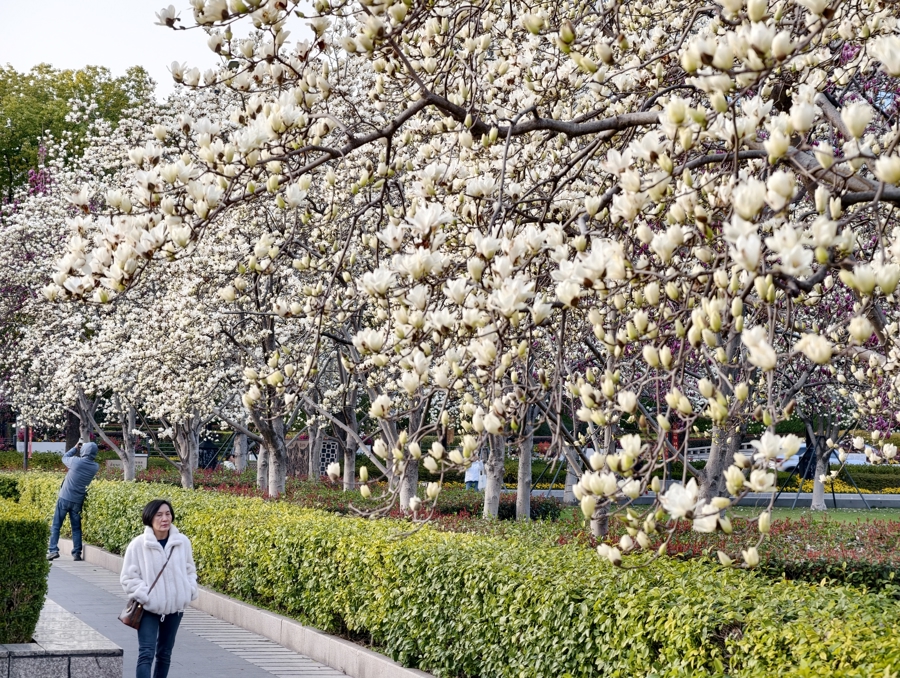 东说念主民公园的玉兰花劝诱着市民旅客打卡。白的、红的竞相争艳。