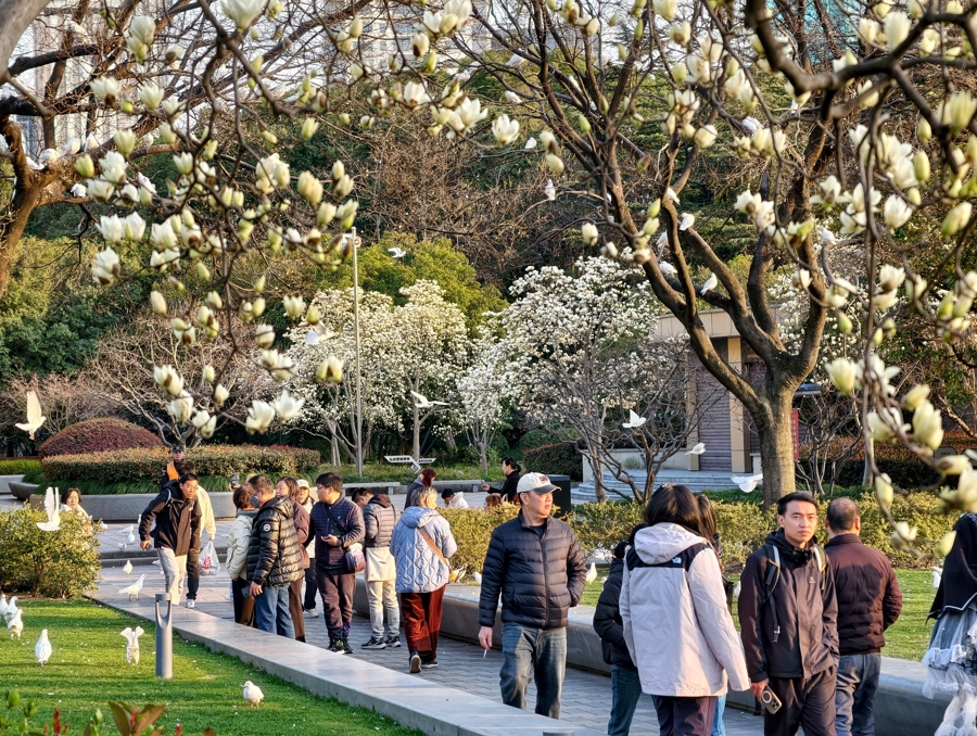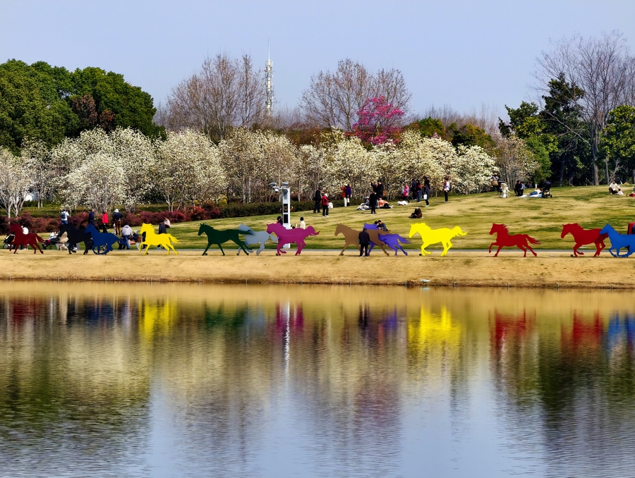 闵行文化公园玉兰花成片盛放,与湖边彩色的“奔马”一同装点着春天。