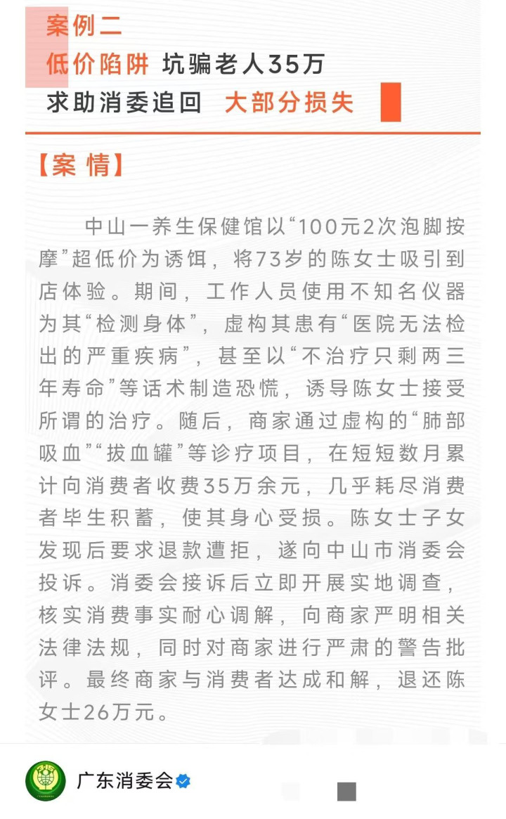 中山一养生保健馆以“100元2次泡脚推拿”超廉价为钓饵,将73岁的陈女士诱导到店体验。其间,使命主谈主员使用不驰名仪器为其“检测躯壳”,编造其患有“病院无法检出的严重疾病”,以致以“不调整只剩两三年寿命”等话术制造战栗,辅导陈女士罗致所谓的调整。随后,商家通过编造的“肺部吸血”“拔血罐”等诊疗样式,在短短数月累计向消费者收费35万余元,险些阔绰消费者终生集合,使其身心受损。